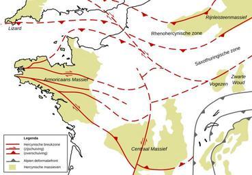 | Keywords: French Hercynian massifs NL.svg Service Géologique National ; 1996 Carte géologique de la France au millionième Éditions BRGM 6<sup>e</sup> druk Paris Debelmas J ; 1974 Géologie de la France 1 vieux massifs et grands bassins sédimentaires Doin éditeurs Paris ISBN 2-7040-0011-5 Martínez-Catalán J R ; 1990 A non-cylindrical model for the northwest Iberian allochthonous terranes and their equivalents in the Hercynian belt of Western Europe Tectonophysics 179 pp 253-272 Matte Ph ; Maluski H ; Rajlich P Franke P ; 1990 Terrane boundaries in the Bohemian Massif Result of large-scale Variscan shearing Tectonophysics 177 pp 151-170 Pharaoh T C ; 1999 Palaeozoic terranes and their lithospheric boundaries within the Trans-European Suture Zone TESZ a review Tectonophysics 314 pp 17-41 own Woudloper date Variscan orogeny Geological maps of the Netherlands Geological maps of Belgium Geological maps of France Geological maps of Germany SVG geology Structural geology maps Maps in Dutch |