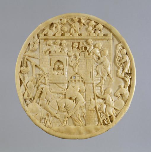 | Keywords: French - Mirror Case with Attack on the Castle of Love - Walters 71169 - Top.jpg The popularity of ivory luxury goods reached its height around 1350 but they were made well into the 15th century Associated with intimacy mirrors were often given as courting gifts A portable mirror consisted of a case in two parts with a polished metal disk fitted inside In this allegorical battle scene knights attack ladies in a castle using catapults and crossbows that launch flowers The ladies also shower their adversaries with flowers dropped from buckets The god of love presides over all A single knight has reached his lady by scaling the wall This scene and those of the knights riding away may be three moments in an elopement narrative The case originally had fantastic animals forming the four corners between 1320 1340 Medieval ivory Diam 5 3/16 x D 3/8 in 13 2 x 1 cm accession number 71 169 24521 Treasury of the Cistercian Abbey of Rein Styria Jacques Seligmann Paris 1928 by purchase Henry Walters Baltimore December 1 1928 by purchase Walters Art Museum Henry Walters Acquired by Henry Walters 1928 Illuminated Manuscripts Masterpieces in Miniature The Walters Art Gallery Baltimore 1984-1985 Medieval Games of Love and War The Walters Art Gallery Baltimore 1995-1996 Images in Ivory Precious Objects of the Gothic Age The Detroit Institute of Arts Detroit; The Walters Art Gallery Baltimore 1997 Highlights from the Collection The Walters Art Gallery Baltimore 1998-2001 The Book of Kings Art War and the Morgan Library's Medieval Picture Bible The Walters Art Museum Baltimore; Academy of the Arts Easton Easton; Princeton University Art Museum Princeton; The Mitchell Gallery Annapolis; Williams College Museum of Art Williamstown 2002 place of origin France Walters Art Museum license French carved ivory mirror cases in the Walters Art Museum 14th-century carved ivory mirror cases Sieges in art Assault on the Castle of Love |