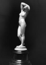 | Keywords: French - Phyrne - Walters 71368 - Right Three Quarter.jpg Phyrne stands on an ivory socle mounted on a wooden base Her elaborately braided coiffure is bound with a ribbon and a strand of graduated pearls Turning her head she shields her face with her left forearm Phyrne ambiguously conteracts this gesture of modesty by raising her right arm over her head to display her voluptuous torso to best advantage In the 19th century the famous courtesan was popularized by Jean-Léon Gérôme's masterpiece of 1861 Phyrne before the Tribunal illustrating the titillating moment when the orator Hypereides won his client's acquittal by baring her bosom to the appreciative Athenian judges Having served as the model for Praxiteles and Apelles as well the subject of Phyrne offered artists an occasion for representing an idealized nude Gérôme's figure frequently served as the prototype for representations of Phrne in bronze ivory and silver The anonymous Walters ivory differs from Gèrôme's composition in the position of the figure's arms 2nd half Other date century 19 ivory cm 27 4 accession number 71 368 13264 William T / Henry Walters Collection Baltimore date of acquisition unknown by purchase Walters Art Museum Henry Walters Acquired by William T or Henry Walters The Spectacular Art of Jean-Léon Gérôme Museo Thyssen-Bornemisza Madrid; J Paul Getty Museum Los Angeles; Musee D'Orsay Paris 2010-2011 place of origin France Walters Art Museum license Art of France in the Walters Art Museum Media contributed by the Walters Art Museum needs category review Sculptures in the Walters Art Museum |