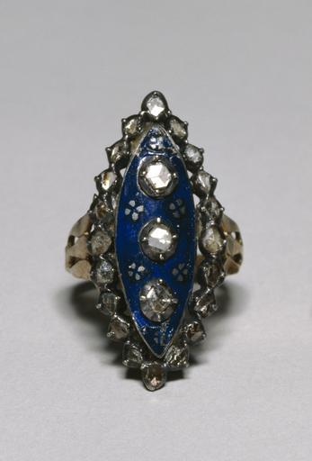 | Keywords: French - Ring with Celestial Motif - Walters 571789 - Top.jpg In the late 18th century and into the 19th century marquise rings set with diamonds on dark blue or red enamel backgrounds became fashionable in Europe The oval marquise bezel like this ring and the rectangular shuttle-shaped bezel were the most popular shapes with diamonds set to imitate stars in the sky or floral sprays It was charactersitic to frame these rings with a border of diamond sparks set in silver mounts The blue enameled rings evoke celestial allusions; rings of this kind were called bagues au firmament Rings of the Heavens early Other date century 19 gold silver enamel diamonds bezel cm 3 49 ; hoop cm 1 91 diam accession number 57 1789 7216 Henry Walters Baltimore date and mode of acquisition unknown Laura F Delano New York date of acquisition unknown by gift Walters Art Museum Gift of Laura F Delano 1947 Jewelry - Ancient to Modern The Walters Art Gallery Baltimore 1979-1980 Bedazzled 5 000 Years of Jewelry from the Walters Art Museum Frist Center for the Visual Arts Nashville; The John and Mable Ringling Museum of Art Sarasota; The Walters Art Museum Baltimore 2006-2009 place of origin France Walters Art Museum license Jewellery in the Walters Art Museum Art of France in the Walters Art Museum Media contributed by the Walters Art Museum needs category review |
