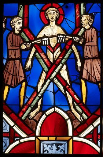 | Keywords: French - Window Panel with Saint Vincent on the Rack - Walters 4669.jpg This stained glass panel once part of a pair of windows from the Lady Chapel at Saint-Germain-des-Prés represents Saint Vincent of Saragossa who was martyred in Gaul France in AD 304 under Emperor Diocletian Saint Vincent's arms and legs are locked into a cross-shaped rack while men tear at his flesh with iron hooks A hand at the upper left commands the torture Saint Vincent suffers calmly enduring great physical pain rather than deny his Christian faith The panel reminded worshipers that their earthly sufferings would be rewarded in heaven between 1245 1247 Medieval paint on stained glass cm 65 41 42 55 ; With supporting frame cm 67 31 44 61 2 54 accession number 46 69 19397 From the Lady Chapel of the Abbey of Saint-Germain-des-Pres Paris Abbey of Saint-Denis 1840 as described by Baron François de Guilhermy Charles Tollin Paris date and mode of acquisition unknown Jacques Seligmann Paris date and mode of acquisition unknown Henry Walters Baltimore December 26 1918 by purchase Walters Art Museum Henry Walters Acquired by Henry Walters 1918 3000 Years of Glass Treasures from The Walters Art Gallery The Walters Art Gallery Baltimore 1982 Vive la France French Treasures from the Middle Ages to Monet The Walters Art Gallery Baltimore 1999-2000 Treasures of Heaven The Cleveland Museum of Art Cleveland; The Walters Art Museum Baltimore; The British Museum London 2010-2011 place of origin Peru Walters Art Museum license 2D Medieval art in the Walters Art Museum Art of France in the Walters Art Museum Media contributed by the Walters Art Museum needs category review Vive la France French Treasures from the Middle Ages to Monet |