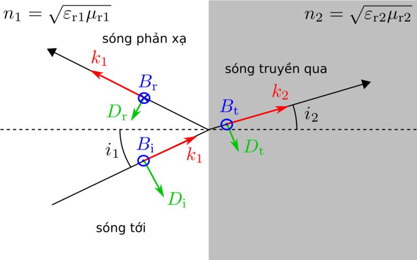 Keywords: Fresnel-equations-sketch-MT-vi.svg Fresnel equations sketch of incident reflected and transmitted waves for transverse magnetical polarisation Are drawn and labelled electric fields E and magnetic fields B as well as angles with the normal wave numbers and refracting indices Coefficients de Fresnel schéma des ondes incidente réfléchie et transmise pour la polarisation magnétique transverse Sont indiqués les champs électriques E et magnétiques B ainsi que les angles d'incidence et de réfraction les nombres d'onde et les indices de réfractions Fresnelsche Formeln Skizze der einfallenden reflektierten und transmittierten Wälen für eine parallele Polarisation Wureden gezeichnet die elektrische E and magnetische B Felder Winkel Wälennummer und Brechungsindexe Translated from Image Fresnel-equations-sketch-MT-fr svg Brachycerophilia User Tttrung 2008-06-02 2008-10-09 Fresnel equations diagrams Created with Inkscape |