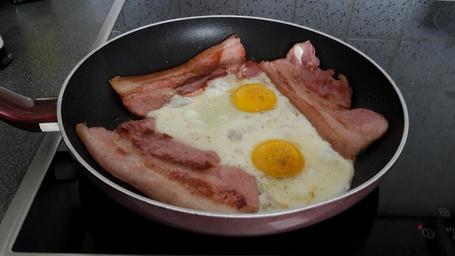 Keywords: fricassee eggs yellow white bacon fried œufs