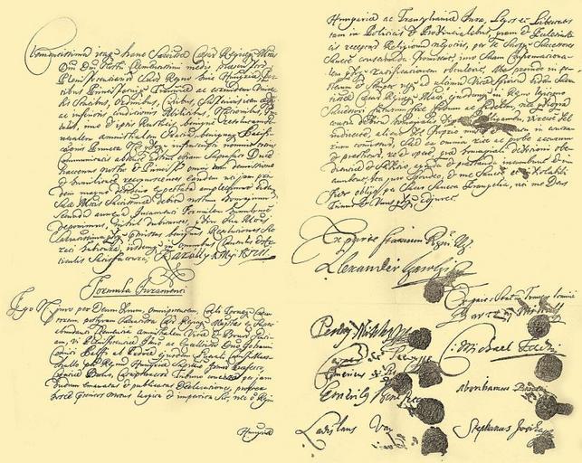 | Keywords: Friede von Sathmar 1711 01.jpg de Originalurkunde des Friedens von Sathmar unterzeichnet am 1 Mai 1711 http //mek oszk hu/00800/00893/html/doc/c400450 htm v11 Österreichisches Staatsarchiv 1711-05-01 Clementissima m itaq ue hanc Sac ra tiss im ae Caesar eae Regiaeq ue M ies t a tis d omi ni d omi ni nostri clementissimi medio praescriptor um plenipotentiarior um suor um regno huic Hung a riae parti- bus principatuiq ue Tran silva niae ac eorundem vniver- sis statibus ordinibus civibus superioris item aeqve ac inferioris conditionis militibus nationibus in- colis imo e t ipsis rusticis benigne resolutam ge- neralem amnistialem gratia m benignaq ue pacifi- ca ti onis puncta nos qvoq ue infrascripti nomine totius communitatis absente adhuc etiam suprafato duce hactenus nostro e t principe omni cum demissione e t humilitate recognoscentes eandem uti jam pri dem magno desiderio expectata m amplectimur eidemq ue Suae M aies t a tis Sac ra tiss i mae debitu m nostrum homagium secundu m annexam iuramenti formulam humilime deponimus nihil dubitantes qvin Sua M aies ttas sic Sacratissima qvoq ue p rae missas benignas resolutiones sit rati habitura iisdemq ue in omnibus clausulis e t ar- ticulis Satisfactura; Kárólly Maji A nn i 1711 Formula iuramenti Ego N juro per Deum vivum omnipotentem coeli terraeq ue crea- torem Postqvam Sacratiss im a Caes a r ea Regiaq ue Maj e stas ex super abundanti clementia amnistialem vitae e t bonor um grati- am vi plenipotentiae il lustrissi mo ac excell en tiss im o d omi no Iohanni Comiti Palffi ab Erdöd ejusdem generali CampiMars- challo per regnu m Hung a riae supremo armor um praefecto Croatiae bano cataphractor um tribuno concessae per jam dudum emanatas e t publicatas declarationes propter hosce p rae teritos motus largita e t impertita sit nec n o n regni Hungariae ac Transylvaniae iura leges et libertates tam in politicis e t provincialibus qvam e t ecclesiasti cis receptar um religionu m negotiis per se suosq ue successores sancte conservanda promiserit imo suam confirmationa- lem qvoq ue ratificationem obtulerit me proinde in po- sterum e t semper usq ue ad ultimu m vitae spiritu m eidem Sacra- tiss im ae Caesar eae Regiaeq ue Ma ies t a ti ejusdemq ue in regno legitimo successori futurum fore fidum ac fidelem nec qvidqva m contra debitu m homagialis vinculi obligamen directe vel indirecte alieno vel proprio motu e t conatu in contra- rium com m issur um sed ea omnia rite ac probe acturum e t praestitur um re e t opere qvae homagiali devotioni obe- dientiae e t servitio agenda et prae- standa incumbunt e t in- cumbent ita juro spondeo e t me sancte et inviolabili fide obligo per sacrosancta Evangelia uti me Deus trinus e t vnus qvoq ue adjuvet Ex parte statuum r e gni U n g ariae Alexander Karolyi m p P H Pereny Miklos m p Ex parte Statuu m Tran silvan iae domini P H Caspar us de Reva m p P H Bartzaj Mihal P H Emericus de Re va m p P H C omes Michael Teleki P H Emeric us Szent Péter i P H Abrahamus Barcsai P H Ladislaus Vay P H Stephanus Josika m p P H PD-old-100 Peace treaties Sándor Károlyi 1669-1743 Documents of the Rákóczi's War for Independence 1711 in military history Manuscripts Signatures of people from Hungary Documents in Latin |