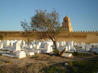 Keywords: Friedhof.JPG Friedhof Awlad Farhan Foto Benutzer Orientalist 2006-11-19 own assumed Orientalist~commonswiki Awlad Farhan Cemetery Minaret of the Great Mosque of Kairouan City walls of Kairouan Trees in Tunisia