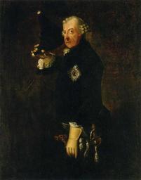 Keywords: Friedrich II., mit Dreispitz, grüßend (Franke).jpg hz Friedrich II mit Dreispitz grüßend Öl auf Leinwand 126 5 x 94 3 cm Stiftung Preußische Schlösser und Gärten GK I 30089 erworben mit Mitteln der Stiftung Deutsche Klassenlotterie Berlin 1764 Oil on canvas cm 126 5 94 3 Friederisiko Friedrich der Große Die Essays ed Generaldirektion der Stiftung Preußische Schlösser und Gärten Berlin-Brandenburg Munich Hirmer 2012 p 216 other versions PD-old-100 Johann Heinrich Christian Franke Friedrich II of Prussia in portraits 1764c 1760s paintings in Germany 1764 oil on canvas paintings Portrait 1764 portrait paintings from Germany Male 18th-century oil on canvas paintings in Germany 18th-century oil portraits of standing men at three-quarter length wearing military uniforms 1764 18th-century portrait paintings in Germany 1764 Justaucorps in art Male portrait paintings with powdered wigs 1764 Portrait paintings of men holding tricorne hats 1764 Portrait paintings of men with swords 1764 Portraits with gloves 1764 Star of the Order of the Black Eagle in portrait paintings 1764 Velvet clothing in art 1764
