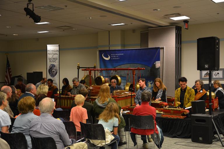 | Keywords: kalamazoo public library kalamazoopubliclibrary kalamazoo friends gamelan live concert liveconcert indoor room auditorium hall In partnership with the Michigan Festival of Sacred Music, Kalamazoo Public Library hosted an afternoon of Gamelan music, the traditional ensemble music of Java and Bali in Indonesia, made up predominantly of percussive instruments on Saturday, 29 October 2016. Chicago’s Friends of the Gamelan, Inc. is a not-for-profit corporation dedicated to the instruction and performance of gamelan music. Photo credit: Pete Koenig www.kpl.gov In partnership with the Michigan Festival of Sacred Music, Kalamazoo Public Library hosted an afternoon of Gamelan music, the traditional ensemble music of Java and Bali in Indonesia, made up predominantly of percussive instruments on Saturday, 29 October 2016. Chicago’s Friends of the Gamelan, Inc. is a not-for-profit corporation dedicated to the instruction and performance of gamelan music. Photo credit: Pete Koenig www.kpl.gov |