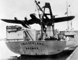 | Keywords: Friesenland (1937).jpg en A Blohm and Voss Ha 139 seaplane being hoisted onto the stern catapult of the German depot ship Friesenland which is docked in her home port of Bremen Germany Initially operated as mail planes by Lufthansa in the 1930s these aircraft saw limited service with the Luftwaffe during the Second World War as mine laying reconnaissance and ambulance aircraft The depot ship Friesenland could carry two of these aircraft and she was launched at Kiel on 23 March 1937 and completed later that year She operated in France and Norway as a seaplane tender/depot ship and was also used as a repair ship at Trondheim After the war Friesenland was taken over by the Royal Navy and continued to be used as a seaplane depot In 1949 she was sold into merchant service and renamed Fair Sky She was sold several more times being renamed Castel Navoso and Argentine Reefer She was scrapped in 1968-1969 de Katapultschiff Friesenland hebt ein Postflugzeug Blohm and Voss Ha 139 auf sein Katapult P03985 005 Author 1937-1939 PD-Australia Blohm Voss Ha 139 Deutsche Luft Hansa 1937 World War II ships of Germany Depot ships Ship cranes Ships in Bremen 1937 in Bremen Black and white photographs |
