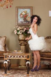 Keywords: frill dress shuttlecock retro salon lady woman surprised overwhelmed stylish fashion model young brunette man photo