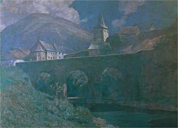 Keywords: Fritz von Wille 0192.jpg Mondschein bei Schuld Öl auf Leinwand 100 x 120 cm http //www eifel-und-kunst de/homepage/kuenstler/fritz-von-wille/html/bildergalerie htm www eifel-und-kunst de by 1941 Creator Fritz von Wille PD-old-70 Fritz von Wille Schuld Ahr Bridges in art