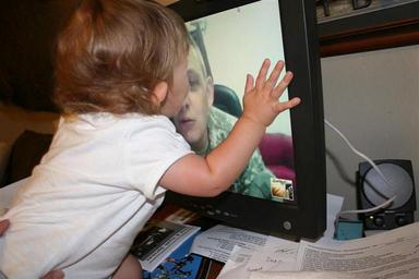 | Keywords: Frocking becomes Family affair DVIDS108885.jpg en Lt Col Nathan Blood brigade effects coordinator for 4th Brigade Combat Team 10th Mountain Division Light Multi-National Division “ Baghdad and his 16-month-old daughter Mackenzie kiss computer images of one another during a web camera communication Blood kissed Mackenzie from the forward operating base and she kissed her dad from Fort Polk La 2008-08-16 Sgt 1st Class Matthew Meadows https //www dvidshub net/image/108885 108885 2008-08-16 09 44 FORWARD OPERATING BASE LOYALTY IQ PD-USGov Fort Polk Images from DoD uploaded by Fæ |