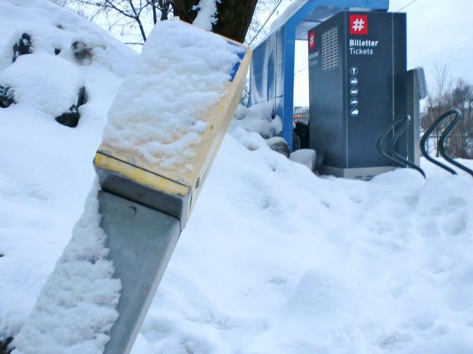 | Keywords: Frøen stasjon 2.jpg en Fun picture at Frøen station Oslo Norway The old-fashioned ticket stamping machine has been both tipped over and got snowed down The modern Flexus ticket machine thrives in the background own Punkmorten 2010-02-17 Frøen stasjon Ticket machines in Norway Flexus |