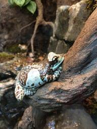 Keywords: frog green speckled amphibian colorful exotic wood logs resting