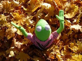 Keywords: frog kermit green doll fig autumn leaves fall foliage maple leaves leather pants costume bavarian