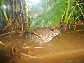 | Keywords: Frog rescued from Haikou market - 01.jpg en This is a common type of frog sold in markets as food in Haikou Hainan China This particular frog named Elba and sometimes Greener was rescued from a market purchased for 2 yuan It is about 14 cm long smaller than the others It now lives in a home in Haikou in a terrarium It spends most of its time with only the top of its head exposed even if there's muddy wet sand there instead of a depth of water A blob of raw meat will disappear if left nearby If disturbed it can jump quite high and is quite strong 2013-02-01 10 00 32 own Anna Frodesiak cc-zero Uploaded with UploadWizard Unidentified Anura Files by User Anna Frodesiak |