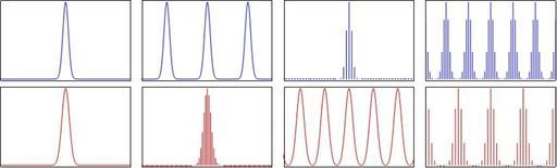 | Keywords: From Continuous To Discrete Fourier Transform.gif Fourier transform and the discrete Fourier transform <u>Left column </u> A continuous function top and its Fourier transform bottom <u>Center-left column </u> Periodic summation of the original function top Fourier transform bottom is zero except at discrete points The inverse transform is a sum of sinusoids called Fourier series <u>Center-right column </u> Original function is discretized multiplied by a Dirac comb top Its Fourier transform bottom is a periodic summation DTFT of the original transform <u>Right column </u> The DFT bottom computes discrete samples of the continuous DTFT The inverse DFT top is a periodic summation of the original samples The FFT algorithm computes one cycle of the DFT and its inverse is one cycle of the inverse DFT 2011-12-05 own Sbyrnes321 <pre> Source code written in Mathematica 6 0 by Steve Byrnes 2011 I release this code into the public domain ClearAll Global` SetOptionsPlot Frame -> True FrameTicks -> None Axes -> False PlotRange -> -8 8 All ; SetOptionsListPlot Frame -> True FrameTicks -> None Axes -> False Filling -> Axis PlotStyle -> None PlotRange -> -8 8 All ; fx_ Exp- 4/3 \Pi x 2; gx_ Exp- 3/4 \Pi x 2; repeatedfx_ p_ Sumfx + n p n -10 10 ; repeatedgx_ p_ Sumgx + n p n -10 10 ; plotf Plotfx x -10 10 PlotStyle -> DarkerBlue; plotg Plotgx x -10 10 PlotStyle -> DarkerRed; plotrepeatedf Plotrepeatedfx 5 x -10 10 PlotStyle -> DarkerBlue; discreteg Table x gx x -10 10 1/5 ; plotdiscreteg ListPlotdiscreteg FillingStyle -> DarkerRed; discretef Table x fx x -10 10 1/3 ; plotdiscretef ListPlotdiscretef FillingStyle -> DarkerBlue; plotrepeatedg Plotrepeatedgx 3 x -10 10 PlotStyle -> DarkerRed; discreterepeatedf Table x repeatedfx 11/4 x -12 12 1/4 ; plotdiscreterepeatedf ListPlotdiscreterepeatedf FillingStyle -> DarkerBlue; discreterepeatedg Table x repeatedgx 4 x -12 12 4/11 ; plotdiscreterepeatedg ListPlotdiscreterepeatedg FillingStyle -> DarkerRed; finalimg ShowGraphicsGrid plotf plotrepeatedf plotdiscretef plotdiscreterepeatedf plotg plotdiscreteg plotrepeatedg plotdiscreterepeatedg ImageSize -> 800 SetDirectory C \\Users\\Steve\\Desktop ; Export test gif finalimg</pre> cc-zero math Uploaded with UploadWizard Fourier analysis Images with Mathematica source code |