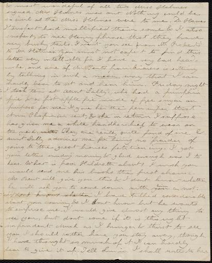 | Keywords: From Deborah Weston to Anne Warren Weston; Sunday, January 1, 1837 p3.jpg Page p 3 Call Number Ms A 9 2 v 9 n 1 Format Autograph Letter Signed Extent 4 p 9 3/4 x 7 3/4 in Creator Weston Deborah 1814-1889 Date of creation 1837-01-01 Place of creation New Bedford MA Recipient Weston Anne Warren 1812-1890 BPL department Rare Books Transcription most wonderful of all two Miss Holmes signed Mrs Holmes was out Nothing could be so civil and the Miss Holmes were to me Dr Hawes I suspect had mollified them some I also suspect to use Henry ˜s phrase that they have very bushy tails I went you see from Mr Roberts ™ to Mr Holmes ™ You must not expect to find this letter very intelligible for I have a very bad headache and one of Mr Bent ™s parishioners is sitting by talking in such a mean way that I can hardly bear to sit and hear him Friday night I took tea at Aunt Sally ™s who had a pumpkin pie a pot apple pie made of free sugar on purpose for me I gave her the pen wiper that Ann Chapman sent she in return I suppose has given me a white handkerchief to wear on the neck They are really quite fond of me Aunt Sally admires me for being no ˜fraider of going to the great houses petitioning I got your letters Sunday morning glad enough was I to hear What is poor Hildreth about I wish you would send me his books the first chance Mr Bent will give you this I don ™t know whether he will ask you to come down with him or not I have talked considerable about you coming I don ™t know but he wants to surprise me I would give almost any thing to see you but don ™t come if it is this night imprudent Much as I hunger thirst to see you I should rather have you stay away though I have thought so much of it I can hardly bear to give it up Tell Lucia I shall write to her Flickr data on 2011-08-02 Camera Sinar AG Sinarback 54 FW Sinar m Tags dc identifier 08_07_000003 License CC BY 2 0 User Boston Public Library BPL Flickr http //flickr com/photos/24029425 N06/2653128852 From Deborah Weston to Anne Warren Weston; Sunday January 1 1837 2008-07-08 15 38 03 Weston Deborah 1814-1889 PD-old-100 User Flickr upload bot/upload 23 34 2 August 2011 UTC Fæ CC BY 2 0 Deborah Weston anti-slavery letters Photos uploaded from Flickr by Fæ using a script Taken with Sinarback 54 |