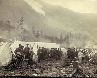 | Keywords: Front Street, Sheep Camp, Chilkoot Trail, Alaska, 1897 (LAROCHE 103).jpeg check categories 8 June 2016 3 Photograph Creator Frank La Roche Caption on image Front Street Sheep Camp c1897 Depicts Jack London and fellow travelers Jim Goodman Fred Thompson and Martin Tarwater Front Street at Sheep Camp settlement This is the principal camp on the Dyea Trail In August and September there were a thousand or more people encamped here The log structure on the left was the leading hotel where you might eat for 75 cents and sleep on the floor for 50 cents if you furnished your own bedding Beyond here a meal could not be had at any price This is right on the edge of what is known as the timber line Thence to the other side is about ten miles In all the district there is not sufficient wood to heat a cup of coffee so you are obilged to carry your own wood of you want to camp within that distance Frank La Roche En Route to the Klondike 1898 Klondike Gold Rush Subjects LCTGM Tents--Alaska Subjects LCSH Chilkoot Trail; Trails--Alaska; Sheep Camp Alaska depicted place United States--Alaska--Sheep Camp 1897 Institution University of Washington UWASH-LAROCHE-source accession number laroche 103 PD-old-auto-1923 1936 Information field Order Number LAR208 Images from the Frank La Roche Photographs Collection to check Tents Chilkoot Trail Trails |
