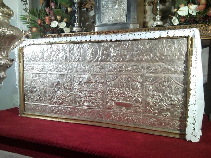 | Keywords: Frontal de prata do altar do Santíssimo Sacramento com iconografia eucarística do século XVIII, Tesouro da Sé de Angra do Heroísmo. Dimensões 140x90 cm..jpg en Front panel of the main alter 140 x 90 cm with eucharistic iconography from the 18th century Sé Cathedral Sé Angra do Heroísmo Terceira Azores Portugal pt Frontal de prata do altar do Santíssimo Sacramento com iconografia eucarística do século XVIII Tesouro da Sé de Angra do Heroísmo dimensões 140x90 cm Own 10/12/2008 José Luís Ávila Silveira/Pedro Noronha e Costa Arquivo pessoal Sé Catedral de Angra do Heroísmo |