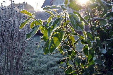 Keywords: frost hoarfrost ice winter frozen cold leaves branches morning sun trees meadow