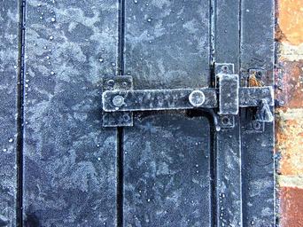 Keywords: frost icy lock bolt door shed outhouse brick wood latch black rime ice cold winter secure locked
