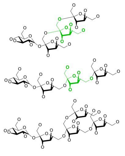 | Keywords: Fructans.svg Three different types of fructans exist inulins levans and the mixed type called graminans The green fructose parts can appear 0 to n times The bottom structure is really called 6 6 1 kestopentaose Created with bkchem+inkscape I created the fructose parts manually to try to reflect real angles in the ring Own 2006-08-03 User Ayacop PD Keywords Inulin Levan Graminan Kestose Fructan Polysaccharides | ||||