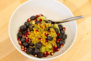 Keywords: fruit fruit salad breakfast blueberries kiwi pomegranate pasionsfrucht nutrition food delicious eat healthy vitamins fruits sweet tropical fruits colorful exotic fruit exotic