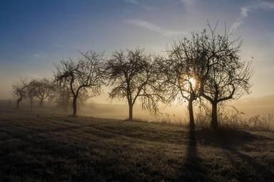 Keywords: fruit trees morning dew november sunrise cold back light sun fog nature morgentau meadow lichtspiel