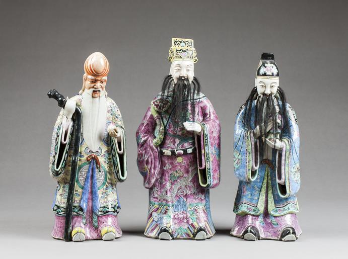 Keywords: Fu, Lu och Shou xing från kinesisk mytologi, 1900-tal - Hallwylska museet - 100914.tif LSH artwork sv FIGUR Lu Xing stjärnguden för hög rang Stående med vänstra handen framför bröstet den högra hållande en ju-i-spira Skägg och mustascher av svart tagel Iklädd svart huvudbonad och fotsid rödgredelin rock med ornament i gult blått och rödgredelint <br/>Lu Xing är en av de tre taoistiska stjärngudarna för lycka hög rang och långt liv <br/>Inköpt hos Bukowskis konsthandel 1910 tillsammans med XI C h b 28I och30 för 4 500 Kr <br/>Figure Figure The Three Star Gods of Longevity High Rank and Happiness porcelain decorated in overglaze enamels<br/>Qing dynasty c 1900<br/>The Three Daoist Star Gods were deities linked by astrologers to planets and stars in the sky Popular in temples and households they may still be seen in Chinese shops and restaurants today The central figure of Shou Xing deity of long life has an enlarged cranium denoting wisdom An old man he holds a staff in one hand the one of the Peaches of Immortality in the other Lu Xing deity of High Rank holds a ruyi wish-fulfilling sceptre in one hand and wears the cap and robes of an official Fu Xing deity of Happiness carries a small boy in his hands Fu Xing and Lu Xing both have real hair inserted into holes in their faces to form luxuriant beards moustaches and whiskers The triad were bought at Bukowskis in 1910 and the pieces were probably made not long before that date original caption Fu Lu och Shou xing från kinesiskmytologi 1900-tal <br/> Nyckelord Mytologi Religioner Figurer 1900 size cm 57 HWY place of origin CN original filename hm_dig16340 14858 inventory number HWY XLVIII XI C h b 29 100914 CC-BY-SA Jens Mohr <gallery caption Different images of same object > File Kinesisk figur föreställande Shou Xing är en av de tre taoistiska stjärngudarna för lycka - Hallwylska museet - 95994 tif </gallery> Religion Mythology Figurines Chinese ceramics in the Hallwyl Museum Sweden Glass Porcelain Ceramics of Korea Ceramics of Japan Ceramics Jens Mohr Media contributed by LSH 2015-11 |