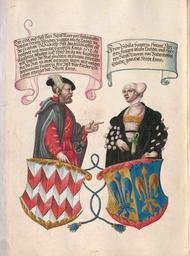 | Keywords: Fugger Ehrenbuch 060.jpg Geheimes Ehrenbuch der Fugger hergestellt in der Werkstatt Jörg Breu d J 1545 “1549<br /> Portrait- und Wappendarstellung Hans Marx von Bubenhofen Sibilla Fuggerin Fugger von der Lilie http //daten digitale-sammlungen de/~db/0004/bsb00042105/images/ 1545 “1549 workshop PD-old-100 Geheimes Ehrenbuch der Fugger Portraits in Geheimes Ehrenbuch der Fugger Coats of arms in Geheimes Ehrenbuch der Fugger Coats of arms of Fugger von der Lilie family Coats of arms of Bubenhofen family |