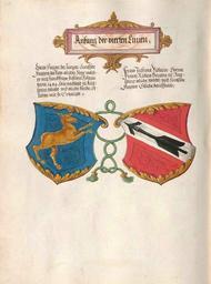 | Keywords: Fugger Ehrenbuch 348.jpg Geheimes Ehrenbuch der Fugger hergestellt in der Werkstatt Jörg Breu d J 1545 “1549<br /> Seite 348 Stammreihen der Fugger vom Reh Wappen Lucas Fugger vom Reh d J Justina Ridlerin Ridler Hinweis Eine Seitenzahl 349 gibt es in der handschriftlichen Paginierung der Handschrift nicht Die nächste Seite ist mit 350 bezeichnet http //daten digitale-sammlungen de/~db/0004/bsb00042105/images/ 1545 “1549 workshop PD-old-100 Geheimes Ehrenbuch der Fugger Coats of arms in Geheimes Ehrenbuch der Fugger Coats of arms of Fugger vom Reh family Coats of arms of families of Germany - R Ridler Arrows in heraldry |
