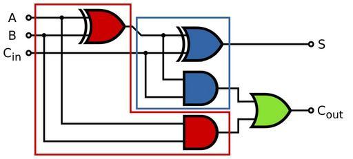 Keywords: Full Adder Modules.svg Circuit Diagram of a Full Adder showing how it is constructed from two half adders red and blue with an OR gate green Own drawing Inkscape 0 43 05/08/06 inductiveload PD Adders digital circuits