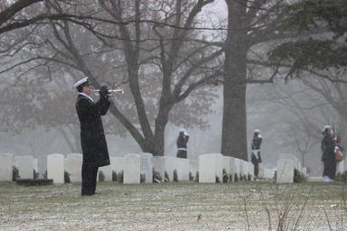 | Keywords: Full honors funeral 140121-N-ZE053-004.jpg en Chief Musician Stan Curtis plays taps during a full honors funeral at Arlington National Cemetery A snow storm closed the federal government that day however the Navy Band and the Ceremonial Guard continued to render honors to veterans The band performs music at official military government and special events U S Navy photo by Chief Musician Christian Johanson/Released 2014-01-21 Christian Johanson https //www dvidshub net/image/1156902 140121-N-ZE053-004 2014-01-27 23 10 ARLINGTON VA US PD-USGov-Military-Navy Arlington National Cemetery Images from DoD uploaded by Fæ |