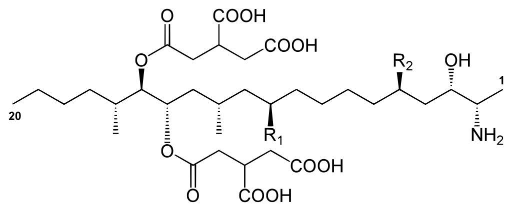Keywords: Fumonisin B1 B2 B3 B4.svg Fumonisin B1 R1 OH R2 OH Fumonisin B2 R1 H R2 OH Fumonisin B3 R1 OH R2 H Fumonisin B4 R1 H R2 H Own 2008-05-20 Yikrazuul Fumonisins