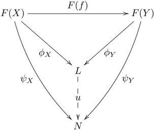 | Keywords: Functor co-cone (extended).svg en A commutative diagram depicting a universal co-cone under a functor Own Ryan Reich 2009-01-14 File FunctorCone-04 png LaTeX source <pre> \documentclass amsart \usepackage amsmath amssymb nopageno \usepackageall xy \begin document \begin equation \xymatrix C+2em R+2em F X \arrr F f F Y \\ L \ar <- ul 0 4 -<1ex 1ex> \phi_X \ar <- ur_ 0 4 -<1ex 1ex> \phi_Y \\ N \ar <- / 10pt/uul \psi_X \ar <- /_10pt/uur_ \psi_Y \ar <-- u +<5pt 5pt> u \end equation \end document </pre> Commutative diagrams Images with LaTeX source code |