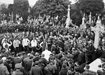 | Keywords: Funeral of O'Donovan Rossa, graveside in Glasnevin Cemetery, St. James's band, crowds (26203288753).jpg The Fools the Fools the Fools One hundred years and one day after his execution by firing squad in Kilmainham Gaol we have Padraig Pearse in a crowd shot This should provide rich pickings identifying characters who were to go on and play a part in the drama that was to unfold one year later Today's contributors remind us of the http //www irishexaminer com/ireland/video-quest-to-find-the-missing-names-of-people-in-iconic-odonovan-rossa-funeral-photograph-345790 html ongoing effort to name those in this image Helped by this http //www glasnevintrust ie/visit-glasnevin/news/the-fools-the-fools-the-fools/Funeral_of_Jeremiah_O_Donovan_Rossa_with_numbers jpg numbered version the Glasnevin Trust have sourced names for more than a few in the image Apart from the St James's Band in the background and the more obvious nationally known names Pearse Griffith MacDonagh MacBride Brugha Clarke Béaslaà Plunkett Ó Ceallaigh etc members of the public have put names to others there that day If any of our contributors can help the http //www glasnevintrust ie/visit-glasnevin/news/the-fools-the-fools-the-fools/ Glasnevin Trust would I'm sure be delighted with the input Photographer Brendan Keogh Collection http //catalogue nli ie/Collection/vtls000029624 Keogh Photographic Collection Date August 1915 NLI Ref http //catalogue nli ie/Record/vtls000030816 Ke 234 You can also view this image and many thousands of others on the NLI ™s catalogue at http //catalogue nli ie catalogue nli ie https //www flickr com/photos/nlireland/26203288753/ Funeral of O'Donovan Rossa graveside in Glasnevin Cemetery St James's band crowds https //www flickr com/people/47290943 N03 National Library of Ireland on The Commons http //www nli ie/en/flickr-commons aspx National Library of Ireland on The Commons Flickr Commons 53 370057 -6 276476 source Flickr Flickr-no known copyright restrictions PD-Old PD-1923 National Library of Ireland on The Commons https //flickr com/photos/47290943 N03/26203288753 2016-05-04 23 50 50 No known copyright restrictions Arthur Griffith Cathal Brugha Glasnevin Cemetery Jeremiah O'Donovan Rossa Images from the National Library of Ireland Patrick Pearse Speech Sunday Crowds Funerals in Ireland 1915 in Ireland Dublin in the 1910s |