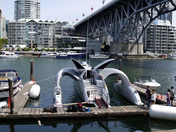 Keywords: futuristic earthrace catamaran boat ship water pacific ocean vancouver british columbia canada buildings bridge granville island city pier skyscraper technic transportation metal