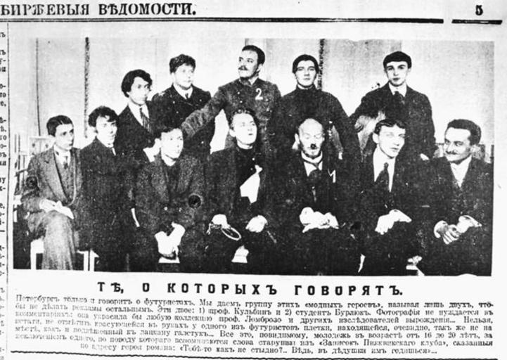 | Keywords: Futuristy (Birzhevye vedomosti).jpg Футу исты http //www hlebnikov ru/biography/1913/14 htm before 1917 anonimous PD-RusEmpire ImageNote 1 162 92 59 75 704 500 2 Пасте нак ImageNoteEnd 1 ImageNote 2 407 156 60 86 704 500 2 Кульбин ImageNoteEnd 2 ImageNote 3 508 164 66 81 704 500 2 Лившиц ImageNoteEnd 3 ImageNote 4 116 143 62 75 704 500 2 андельштам ImageNoteEnd 4 ImageNote 5 52 157 58 70 704 500 2 Рю ик Ивнев ImageNoteEnd 5 ImageNote 6 318 59 53 73 704 500 2 иколай Бу люк ImageNoteEnd 6 ImageNote 7 310 152 67 69 704 500 2 Каменский ImageNoteEnd 7 Russian futurist poets Files uploaded by Shakko from various sources Burluk family |