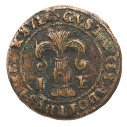 | Keywords: Fyrk, 1620-tal - Skoklosters slott - 109220.tif Markus Kock Cronström sv Gustav II Adolf 1611-1632 <br/>Åtsida vasen IF GUSTAVUS ADOLPHVS DG REX SVEC <br/>Frånsida lejon MONETA NOVA CUPREA NICOPEN original caption Fyrk 1620-tal <br/> Nyckelord Fyrk Föremålsbild Pengar 1620-tal Kopparmynt Vase 1628 copper size mm 30 2 SKO GUSTAV II ADOLF place of origin Nyköping SE original filename sm_dig20018 23650 inventory number SKO 2397 109220 CC-BY-SA Miguel Herranz <gallery caption Different images of same object > File Fyrk 1620-tal - Skoklosters slott - 109221 tif </gallery> Coins of Sweden Copper coins Miguel Herranz Media contributed by LSH unmatched creator Media contributed by LSH 2016-05 Coins in Skoklosters slott |