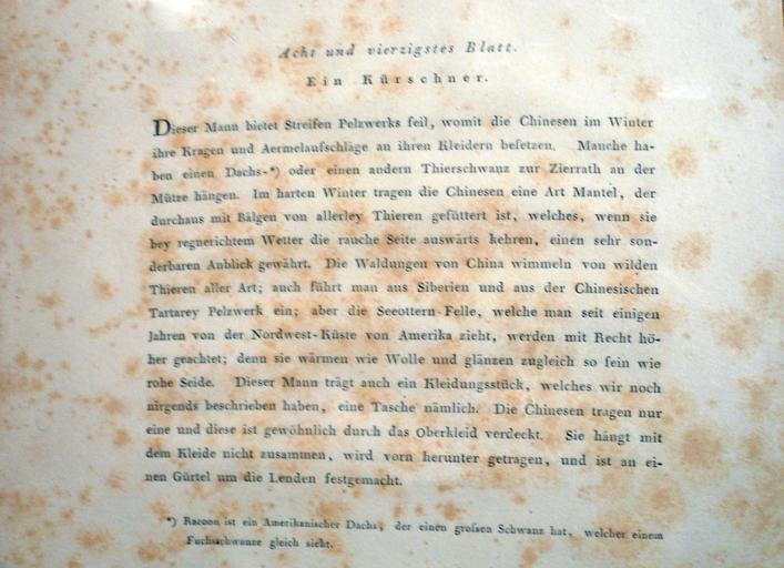 | Keywords: G. H. Mason, The Costume of China, London 1800, deutsche Ausgabe (1).JPG de G H Mason The Costume of China London 1800 deutsche Ausgabe Acht und vierzigstes Blatt Ein Kürschner Blattrückseite Dieser Mann bietet Streifen Pelzwerks feil womit die Chinesen im Winter ihre Kragen und Aermelaufschläge besetzen Category Collection G C Franke 1799 G H Mason PD-old-100 <gallery> File G H Mason The Costume of China London 1800 deutsche Ausgabe 2 JPG File Pelzverkäufer in China Pu-Qua Canton Delin RRR 1799 jpg </gallery> Collection G C Franke Furriers in art Furriers in China Intermediate furs Fur fashion in 1799 |