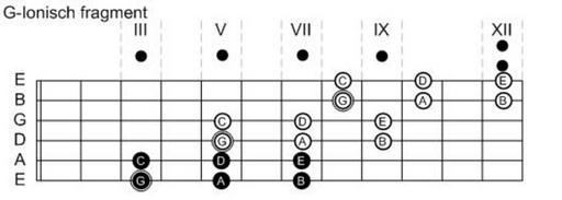Keywords: G-Ionisch fragment.jpg Eigenanfertigung 2005-11-28 own assumed Red Rooster scales on guitar
