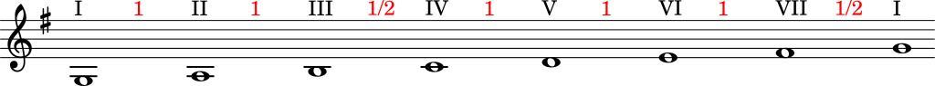 | Keywords: G major scale with degrees and tones.svg en G major scale with degrees and tones fr Gamme de sol majeur avec ses degrés et l'indication des tons 2014-03-01 11 11 56 own Romainbehar LilyPond source <pre> \version 2 16 2 \new Staff \with \remove Time_signature_engraver \set Score defaultBarType empty \clef treble \key g \major g1 \markup I \once \override NoteHead 'transparent t c \markup \with-color red 1 a1 \markup II \once \override NoteHead 'transparent t c \markup \with-color red 1 b1 \markup III \once \override NoteHead 'transparent t c \markup \with-color red 1/2 c'1 \markup IV \once \override NoteHead 'transparent t c \markup \with-color red 1 d'1 \markup V \once \override NoteHead 'transparent t c \markup \with-color red 1 e'1 \markup VI \once \override NoteHead 'transparent t c \markup \with-color red 1 fis'1 \markup VII \once \override NoteHead 'transparent t c \markup \with-color red 1/2 g'1 \markup I </pre> cc-zero Uploaded with UploadWizard Musical scales GNU LilyPond images |