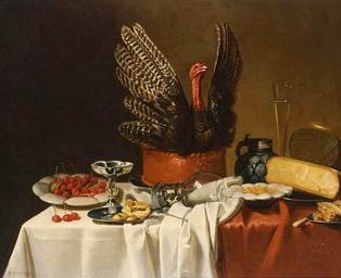 | Keywords: G-vervorn-still-life-with-turkey-pie.jpg A still life with a turkey pie cherries on a plate a silver tazza bread on pewter plates a spoon a roemer an earthenware jug a glass and cheese all on a table draped with a red and white cloth From Sotheby's catalogue Old Master Paintings Amsterdam 14 Nov 2006 lot 37 1658 Oil on canvas Size cm 95 114 5 cite web Sotheby's Old Master Paintings Amsterdam 14 Nov 2006 lot 37 http //www sothebys com/en/auctions/ecatalogue/2006/old-master-paintings-am1013/lot 37 html 22 August 2014 object history In the family of the present owner since 1984 2006 <br/>Sold Sotheby's Old Master Paintings Amsterdam 14 Nov 2006 lot 37 exhibition history credit line lower left G Vervorn fec This formerly unknown still life painter is recorded at the RKD in The Hague with only one other painting a signed and 1658 dated portrait formerly in the collection of Johannes Noll From Sotheby's catalogue Old Master Paintings Amsterdam 14 Nov 2006 lot 37 accession number place of creation Sotheby's Redressed birds Images from Sotheby's Turkeys in art 17th-century still life paintings of food Cherries in art Cheese in art Cuisine of the Netherlands in art Dutch Golden Age paintings PD-Art PD-old-100 |