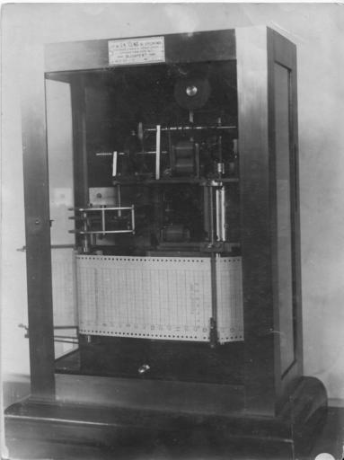 Keywords: Gábor Kornél Tolnai, Centralograph, Budapest, 1931.jpg en Centralograph own invention by engineer Gábor Kornél Tolnai 1902-1982 Budapest in 1928-1931 This picture shows Tolnai-Teletachograph with diagram paper chart paper At the set-up of the centralograph the machine is in connection with a wiring test terminal box The teletachograph has a pencil which draws the diagram with the holder for the pink On the chart of the teletachograph one can read the downtime of the machine for the shift the shift of the spool how slow and how quickly the machine restarts and how long the first lower speed lasted at startup Even spindle speed can be read the white part represents the actual work chart Unevenness in velocity should not be considered The machine's spindle speed can be 7 000 turns but sometimes it is reduced to 6 000 turns apart from the starting torques sv Centralograf egen uppfinning av ingenjör Gábor Kornél Tolnai 1902-1982 Budapest år 1928-1931 Denna bild visar Tolnai-Teletakograf med diagrampapper Vid uppställningen av centralografen är den i förbindelse med teletakografen samt en kopplingsplint Teletakografen har en penna som ritar diagrammet med bläckhållaren På teletakografens diagram avläser man maskinens stillestånd för skiftningen spolväxlingen hur långsamt respektive hur hastigt maskinen åter satts igång och hur länge den första lägre hastigheten varat vid igångsättningen Även spindelhastigheten kan avläsas varvid den vita delen utgör själva arbetsdiagrammet Ojämnheter i hastigheten bör inte förekomma Maskinens spindelhastighet kan vara 7 000 varv men den går ibland ned till 6 000 varv frånsett startmomenten 1931 Own photo author This image is in the public domain because its copyright has expired other versions Custom license marker 2015 01 16 PD-old Uploaded with UploadWizard Gábor Kornél Tolnai |