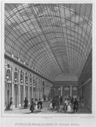 | Keywords: Galerie of the Palais Royal - interior, 1831.jpg The popularity of the Galeries of the Palais Royal dates back to the late eighteenth century when Parisians visited the arcades at all hours in search of entertainment Remaining open until 2 in the morning the Galeries featured circus-like attractions in addition to 180 boutiques In an attempt to rid the garden of prostitutes and criminals Louis-Philippe orchestrated the closing of a portion of the arcades in 1828 and opened the Galerie d'Orléans in 1830 shown here Its cover consisted of a glass roof and it was said to be the most architecturally spectacular of all of the arcades at the time The structure's impressive combination of iron and glass of classical yet advanced styles is testimony to its architectural depth and complexity that influenced the construction of other arcades in Europe However due to its relatively poor location and competition with other arcades the Galerie d'Orléans was one of the least successful arcades of the nineteenth century It was partially demolished in 1935 in an attempt to restore life to the Palais-Royal leaving an open courtyard in the first arrondissement 1831 engraving Institution Brown University Library object history exhibition history credit line accession number 1093265695229500 PD-old Engravings of buildings in Paris Images of Paris from the Brown University Library 1831 in Paris 1831 engravings Historical images of Palais Royal |