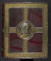 | Keywords: Gallican Psalter with canticles (the 'Lothar Psalter' or 'Lothaire Psalter') - Upper Cover (Add ms 37768).jpg Style Treasure binding Religious miscellaneous Pictorial; Caption Upper Cover; Colour Red; Edge Unspecified exhibition history Decorative Technique Onlaid; Cover Material Metal Silk Leather unspecified Silve Origin Germany Aachen or Northern France Tours Provenance The court of the Emperor Lothar at Aachen probably made for a sister of the Emperor Binding has been added to Wooden boards covered on the outside with brown leather and over that with dark red silk with 4 strips of parchment from a 13th century manuscript inside the front and back covers Silver corner-guards and silver clasps on red velvet bands A large silver-gilt medallion showing a bearded and moustached head in profile wearing a crown or helmet similar to heads of the seals of Louis and Lothar perhaps of the 9th century has been attached to the upper outside cover; this is enclosed in a framework of silver-gilt with a flat conventional leaf-pattern probably of a later date 10th or 11th century The outside lower cover has been slightly hollowed for a 12th-century ivory figure of King David seated with a harp This figure has been removed and is now stored separately object history Text 9c; Germany/France ; Unspecified object type Cc-zero place of creation Binding Germany place of discovery Unspecified British Library image http //www bl uk/catalogues/bookbindings/LargeImage aspx RecordId 020-000018500 ImageId ImageId 57130 Copyright BL Gallican Psalter with canticles the 'Lothar Psalter' or 'Lothaire Psalter' Uploaded with GWToolset Gallican Psalter with canticles the 'Lothar Psalter' or 'Lothaire Psalter' - Upper Cover Add ms 37768 http //www webarchive org uk/bldatasets/bindings/add_ms_37768_fblefr jpg Bookbinding 13th-century bookbinding British Library Bookbindings |