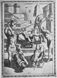 | Keywords: Gallonio Tortures 1591 p14.jpg Woodcut by Tempesta showing a torture/execution scene of martyrs from Gallonio's Tortures and Torments of the Christian Martyrs «Trattato degli instrumenti di martiro e delle varie maniere di martoriare usate da' gentili contro christiani descritti et intagliate in rame; opera di Antonio Gallonio» first publication Rome 1591 / scans from a 1904 reprint woodcut by Antonio Tempesta Reproduction of a painting that is in the public domain because of its age PD-old-100 Trattato degli instrumenti di martiro |