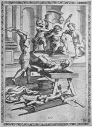 | Keywords: Gallonio Tortures 1591 p29.jpg Woodcut by Tempesta showing a torture/execution scene of martyrs from Gallonio's Tortures and Torments of the Christian Martyrs «Trattato degli instrumenti di martiro e delle varie maniere di martoriare usate da' gentili contro christiani descritti et intagliate in rame; opera di Antonio Gallonio» first publication Rome 1591 / scans from a 1904 reprint woodcut by Antonio Tempesta Reproduction of a painting that is in the public domain because of its age PD-old-100 Trattato degli instrumenti di martiro |
