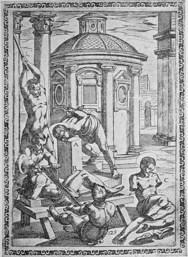 | Keywords: Gallonio Tortures 1591 p32.jpg Woodcut by Tempesta showing a torture/execution scene of martyrs from Gallonio's Tortures and Torments of the Christian Martyrs «Trattato degli instrumenti di martiro e delle varie maniere di martoriare usate da' gentili contro christiani descritti et intagliate in rame; opera di Antonio Gallonio» first publication Rome 1591 / scans from a 1904 reprint woodcut by Antonio Tempesta Reproduction of a painting that is in the public domain because of its age PD-old-100 Trattato degli instrumenti di martiro |