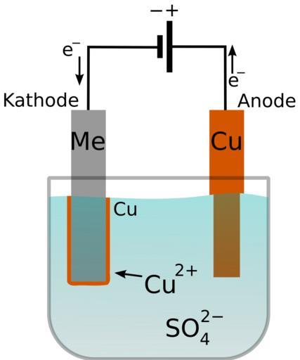 Keywords: GalvanostegiePrinzipskizzeTy.svg Prinzipskizze zur Galvanostegie Galvanotechnik hier elektrolytische Verkupferung eines Metalls Me im Kupfersulfatbad bei Anlegen eines Stromes Electroplating of a metal Me with copper in a copper sulfate bath created with inkscape by Torsten Henning 2006-12-18 Torsten Henning released into the public domain Copper electroplating svg Inkscape DrTorstenHenning Electroplating |